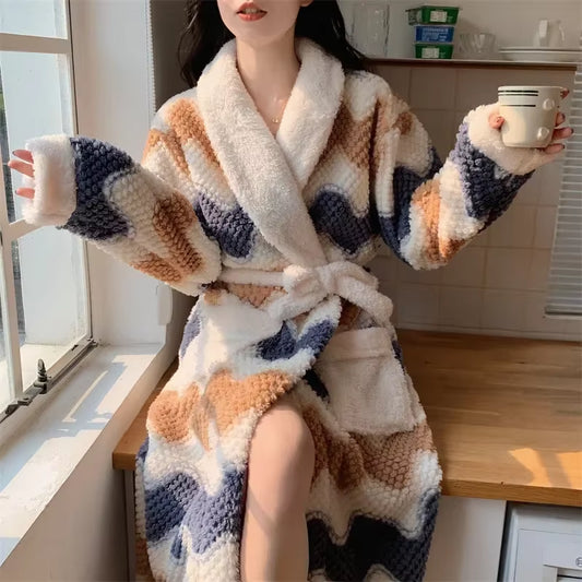 Women'S Pajamas Cute Pijama Winter Sleepwear Warm Robe Sets Long Home Wear Bathrobe plus Velvet Warmth Coral Fleece Nightgown